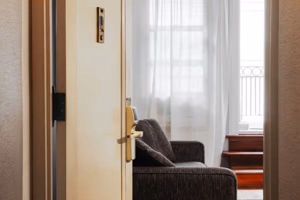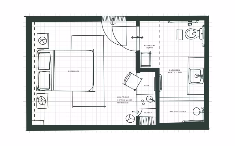 Tucked on the ground floor, the Studio Queen is a quiet nesting pad in Midtown Manhattan. This ADA accessible studio includes a queen bed, streaming-enabled TV, and walk-in shower. Soft textures and clean lines lend a residential feel — just enough space to slow down, unpack, and settle into the city.