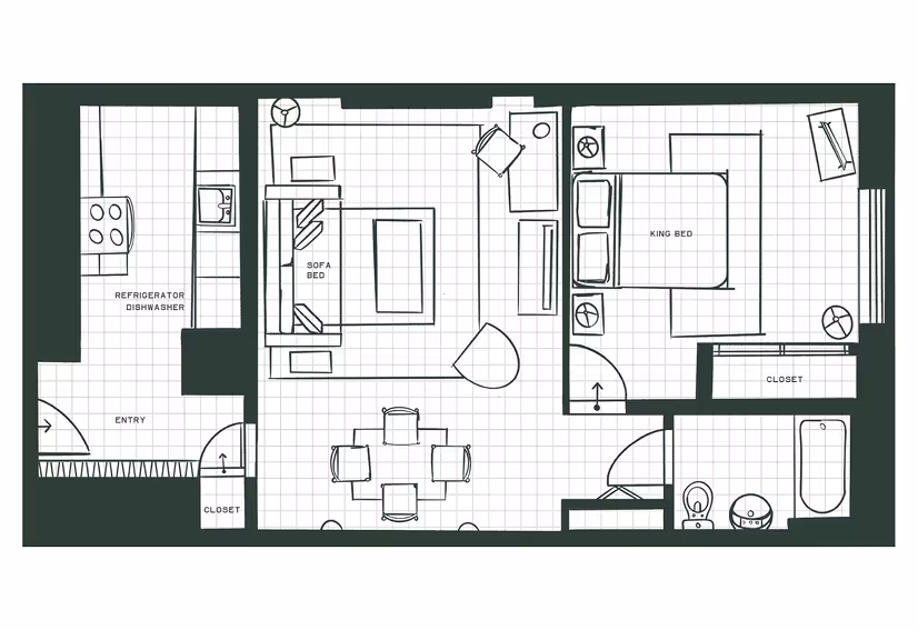 The One-Bedroom King Apartment offers extra space for longer stays in Midtown Manhattan, with a separate living and dining area, streaming-enabled TV, and a full kitchen. The king bedroom is set apart for quiet, and the bathroom includes both a soaking tub and a shower — a home-style apartment with the ease of hotel service.