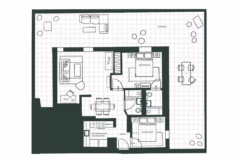 Our Two-Bedroom Penthouse Apartment is the largest stay at The Bayard, featuring two queen bedrooms, a spacious living area with sofa bed and streaming TV, and a full kitchen. Step onto your private balcony for sweeping Midtown Manhattan views, then retreat indoors to soft Parachute linens and a soaking tub that make it feel more like home than hotel.